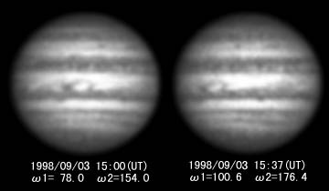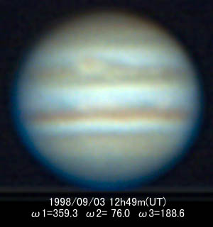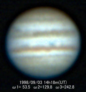 ![]() No.44 1998/09/03 12:49(UT) I=359.3 II= 76.0 Seeing:2-3/10 Transp.:4/5 LV15mm 3 images composite |