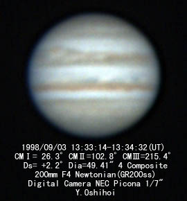 ![]() No.45 1998/09/03 14:18(UT) I= 53.5 II=129.8 Seeing:2-3/10 Transp.:4/5 LV15mm |