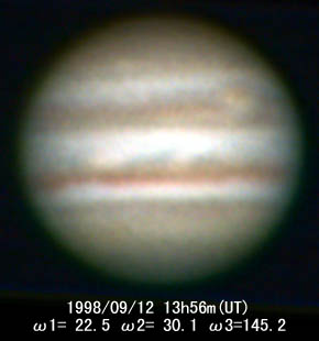 ![]() No.54 1998/09/12 13:56(UT) I= 22.5 II= 30.1 Seeing:4/10 Transp.:2/5 LV15mm 3 images composite |