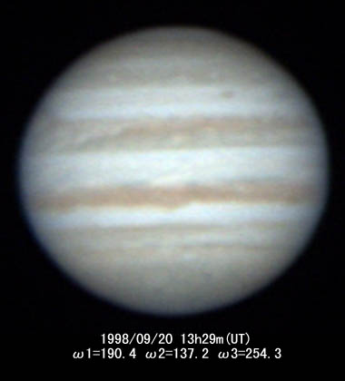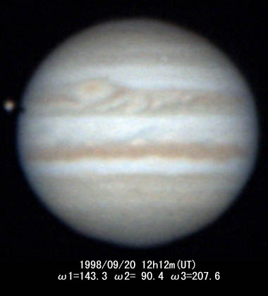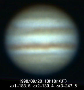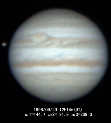 ![]() No.59 1998/09/20 12:28(UT) I=153.1 II=100.2 Seeing:3/10 Transp.:4/5 LV15mm 2 images composite |