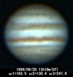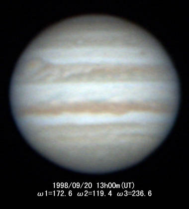 ![]() No.60 1998/09/20 13:18(UT) I=183.5 II=130.4 Seeing:3/10 Transp.:4/5 LV15mm 4 images composite |