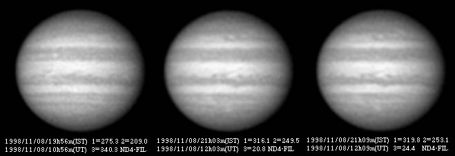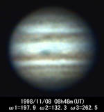 ![]() No.70 1998/11/08 08:48(UT) I=197.9 II=132.3 Seeing:3/10 Transp.:4/5 LV15mm 3 images composite |