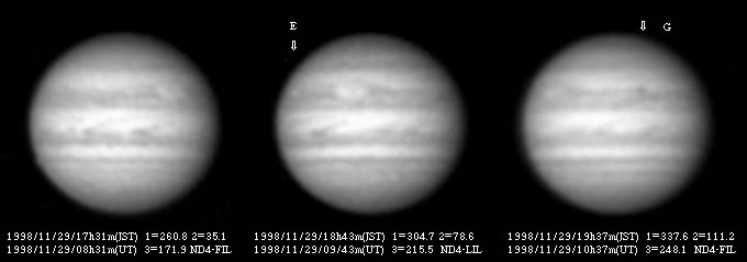 ![]() Image#95 1998/11/29 08:31(UT) I=260.8 II= 35.1 Image#96 1998/11/29 09:43(UT) I=304.7 II= 78.6 Image#97 1998/11/29 10:37(UT) I=337.6 II=111.2 | |