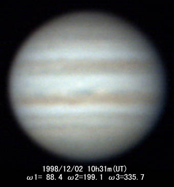 ![]() No.110 1998/12/02 10:30:42(UT) I= 88.4 II=199.1 III=335.7 De= +1.9゜E.Dia=41.78" 31cm F5 ニュートン テレビュー5Xバーローレンズ 1゜プリズム 合成 F35 NEC PICONA 1/7秒 8枚コンポジット |