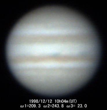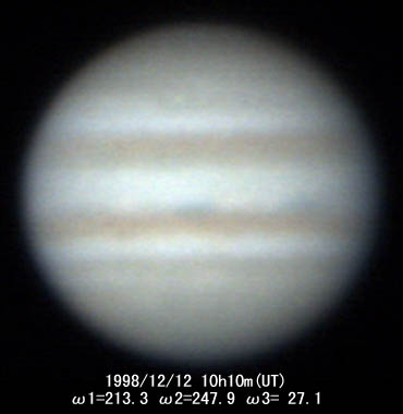 ![]() No.112 1998/12/12 10:10:10(UT) I=213.3 II=247.9 III= 27.1 De= +1.9゜E.Dia=40.43" 31cm F5 ニュートン テレビュー5Xバーローレンズ 1゜プリズム 合成 F39 NEC PICONA 1/7秒 3枚コンポジット |