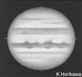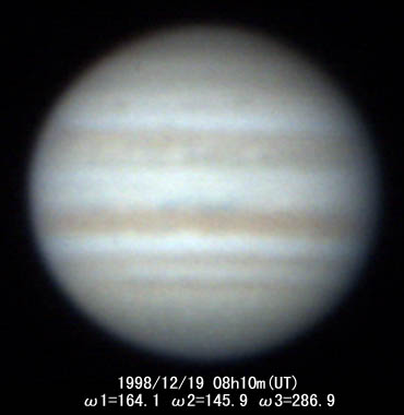 ![]() No.115 1998/12/19 10:32:52(UT) I=251.2 II=232.2 III= 13.3 De= +1.9゜E.Dia=39.53" 31cm F5 ニュートン テレビュー5Xバーローレンズ 1゜プリズム 合成 F39 NEC PICONA 1/7秒 4枚コンポジット |