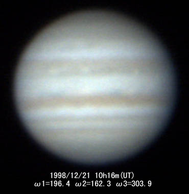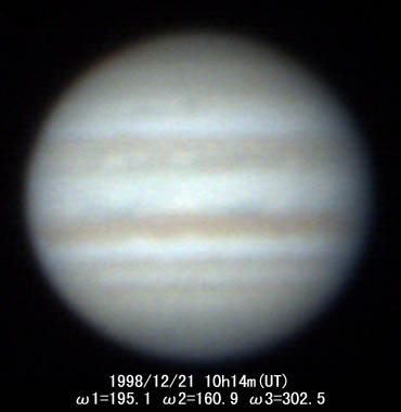![]() No.116 1998/12/21 10:14:02(UT) I=195.1 II=160.9 III=302.5 De= +1.9゜E.Dia=39.29" 31cm F5 ニュートン テレビュー5Xバーローレンズ 1゜プリズム 合成 F39 NEC PICONA 1/7秒 3枚コンポジット |