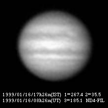 ![]() No.124 1999/01/16 09:15:52(UT) I=299.2 II= 67.0 III=215.5 De= +1.9゜E.Dia=36.50" 31cm F5 ニュートン テレビュー5Xバーローレンズ 1゜プリズム 合成 F39 NEC PICONA 1/7秒 3枚コンポジット |