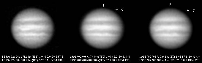 ![]() Image#127 1999/02/06 08:13(UT) I=330.0 II=297.9 Image#128 1999/02/06 08:38(UT) I=345.2 II=313.0 Image#129 1999/02/06 08:41(UT) I=347.1 II=314.0 | |