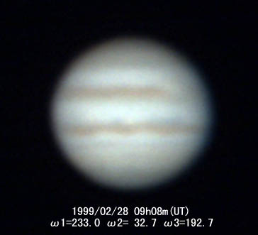 No.139 1999/02/28 09:08:16(UT) I=233.0゜II= 32.7゜III=192.7゜ De= +2.2゜E.Dia=33.72" 31cm F5 ニュートン テレビュー5Xバーローレンズ 3゜プリズム 合成 F32 NEC PICONA 1/7秒 6枚コンポジット