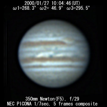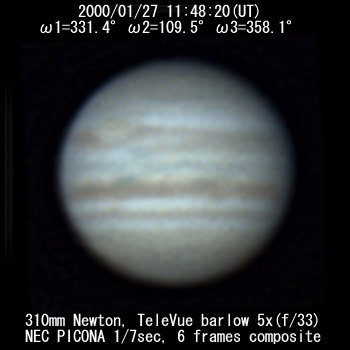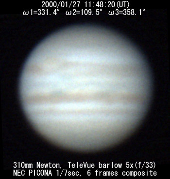 ![]() No.231 2000/01/27 11:48:20(UT) I=331.4 II=109.5 III=358.1 De=+3.0 Dia=39.10" |
