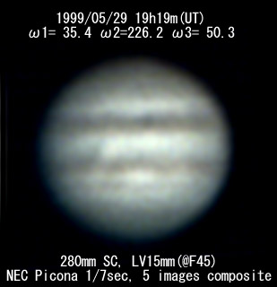 ![]() No. 1 1999/05/29 19:03:24(UT) I= 26.7 II=216.6 III= 40.6 310mm Newton(F5) TeleVue barow 5x @F=39 6 deg. prism, NEC PICONA 1/7sec 4 images median | |