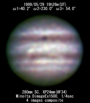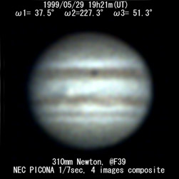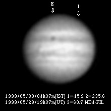 ![]() No. 2 1999/05/29 19:21:06(UT) I= 37.5 II=227.3 III= 51.3 310mm Newton(F5) TeleVue barow 5x @F=39 6 deg. prism, NEC PICONA 1/7sec 4 images median | |