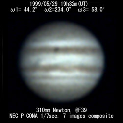 ![]() No. 3 1999/05/29 19:32:08(UT) I= 44.2 II=234.0 III= 58.0 310mm Newton(F5) TeleVue barow 5x @F=39 6 deg. prism, NEC PICONA 1/7sec 7 images median | |