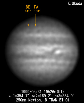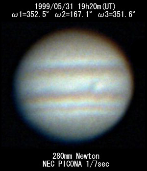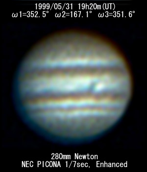 ![]() No. 1 1999/05/31 19h20m(UT) I=352.4 II=167.0 III=351.6 280mm Newton NEC PICONA 1/7sec | ![]() 強調画像作成:伊賀 | |