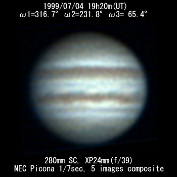![]() No. 5 1999/07/04 20:01:56(UT) I=342.7 II=257.6 III= 91.2 210mm Newton(F5) NEC Picona 1/7sec single frame |