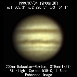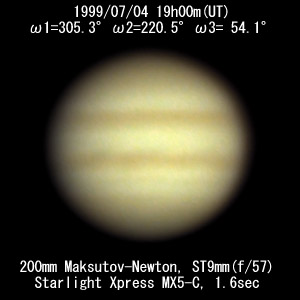 ![]() No. 3 1999/07/04 18h59m39s(UT) I=305.3 II=220.5 III= 54.1 ALTER8N 200mm Maksutov-Newton, ST9mm(f/57) Starlight Xpress MX5-C, Exp: 1.6sec. Seeing:3-5/10 | ![]() 画像強調:伊賀