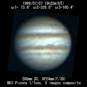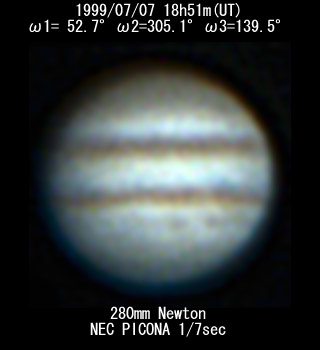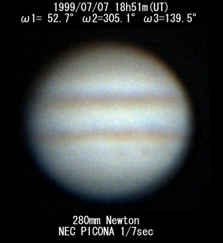 ![]() No. 9 1999/07/07 18h51m(UT) I= 52.7 II=305.1 III=139.5 280mm Newton NEC PICONA 1/7sec | ![]() 強調画像作成:伊賀 | |