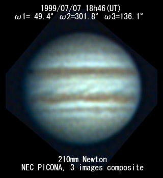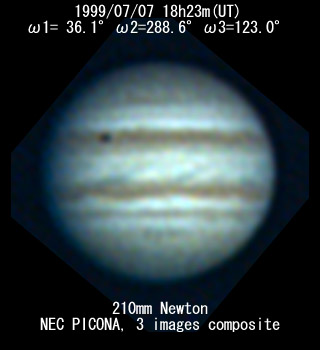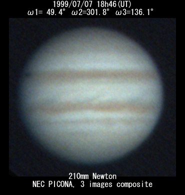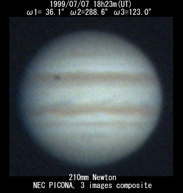 ![]() No. 7 1999/07/07 18:23:20-18:24:54(UT) I= 36.1 II=288.6 III=123.0 210mm Newton(F5) NEC Picona 1/7sec 5 images composite |