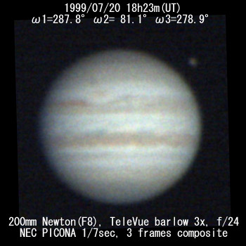 ![]() No. 5 1999/07/20 18:22:40(UT) I=287.8 II= 81.1 III=278.9 De= +3.3゜E.Dia=39.83" |