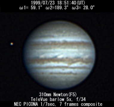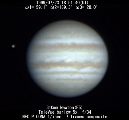 ![]() No. 27 1999/07/23 18:51:40(UT) I= 59.1 II=189.3 III= 28.0 De= +3.3 E.Dia=40.20" |