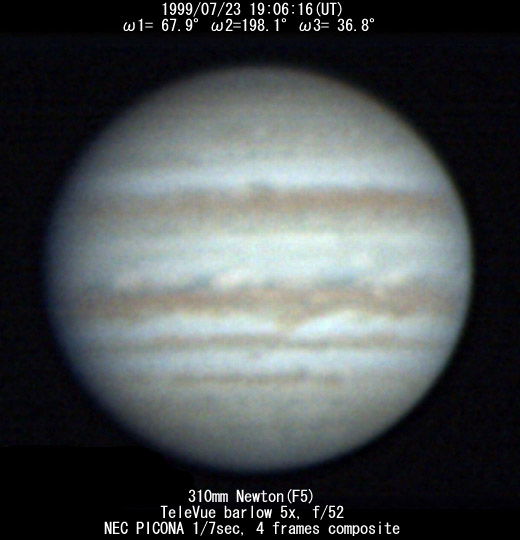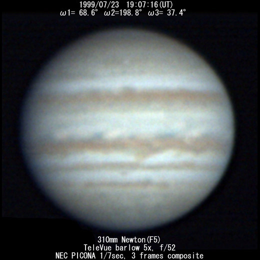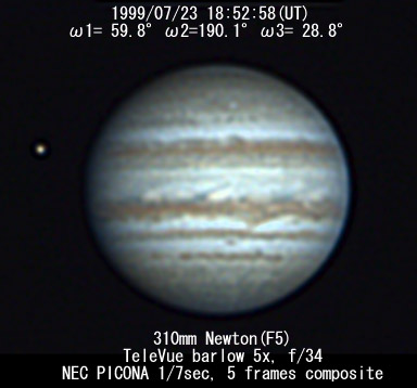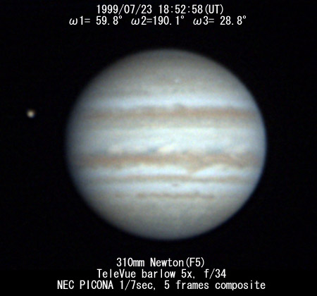 ![]() No. 5 1999/07/23 19h15m(UT) I= 73.9 II=204.0 III= 42.7 310mm Newton, x400 Seeing:7/10 Transp.:3/5 |