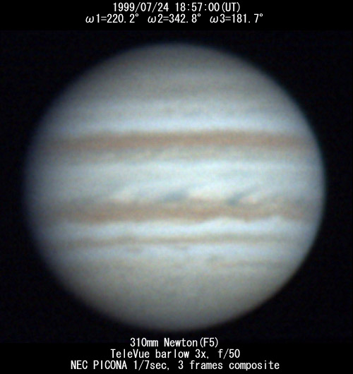 ![]() No. 7 1999/07/24 18h34m(UT) I=206.8 II=329.6 III=168.5 600mm Cassegrain, x600 Seeing:3/10 Transp.:5/5 |