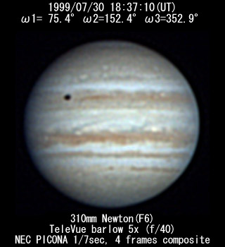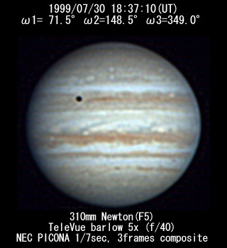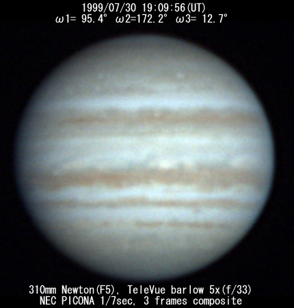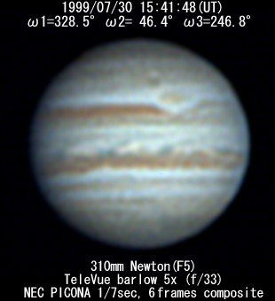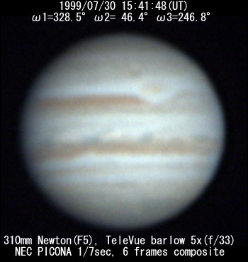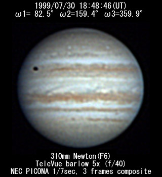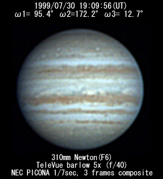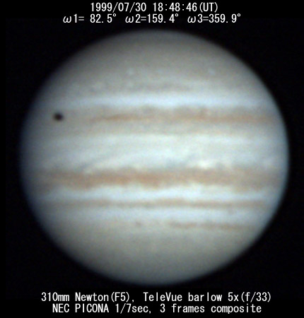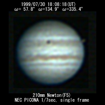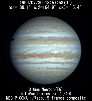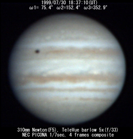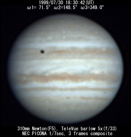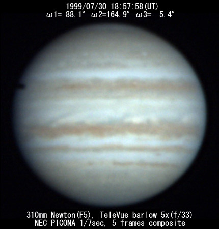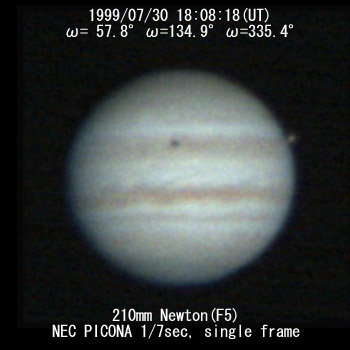![]() No. 11 1999/07/30 18:08:18(UT) I= 57.8 II=134.9 III=335.4 De= +3.4゜E.Dia=41.10" 210mm Newton(F5) NEC Picona 1/7sec single image |