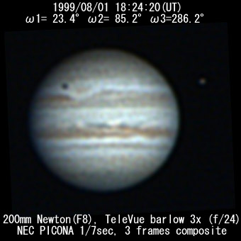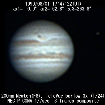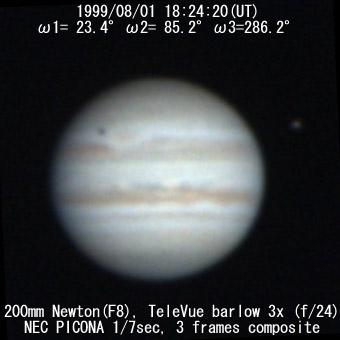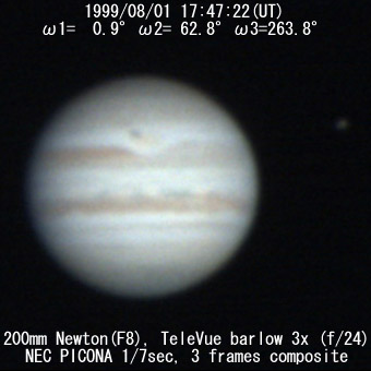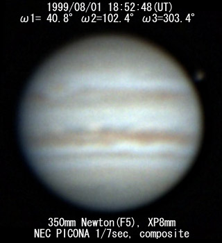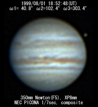 ![]() No. 21 1999/08/01 18h38m(UT) I=234.0 II=303.0 III=144.0 350mm Newton(F5) NEC PICONA 1/7sec | ![]() 強調画像作成:伊賀 | |