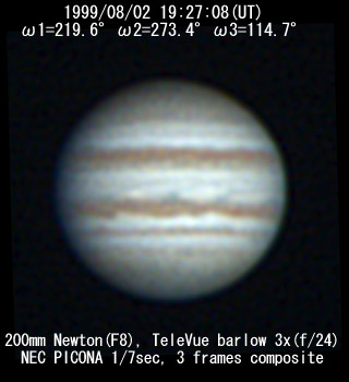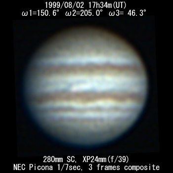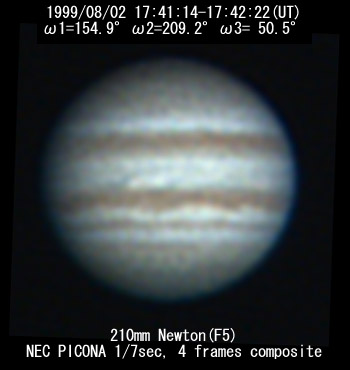 ![]() No. 12 1999/08/02 17:41:14-17:42:22(UT) I=154.9 II=209.2 III= 50.5 De= +3.4゜E.Dia=41.49" 210mm Newton(F5) NEC Picona 1/7sec 4 frames composite |