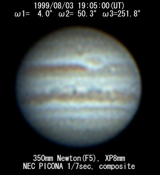 I=312.2 II=358.9 III=200.5 280mm Schmidt-Cassegrain, XP24mm(f/39) NEC Picona 1/7sec, 2 images composite Seeing:4/10 Transp.:5/5