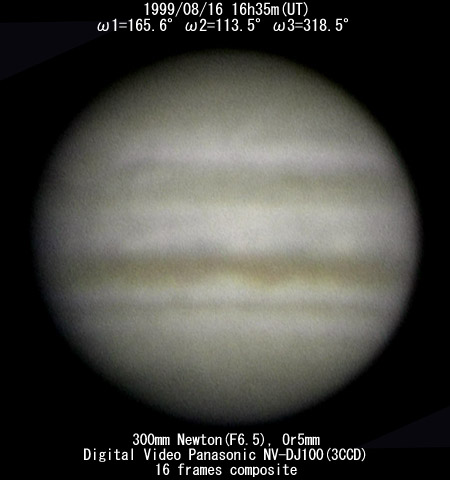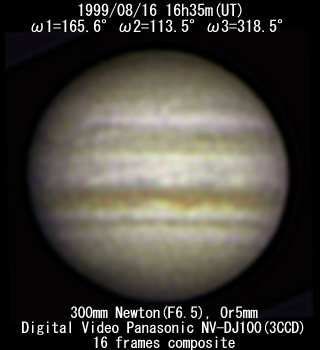 ![]() No. 13 1999/08/16 16h35m(UT) I=165.6 II=113.5 III=318.5 16 frames composite |
