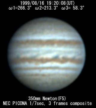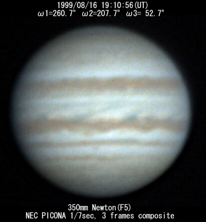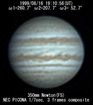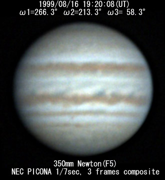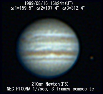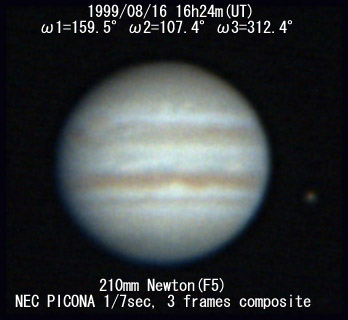 ![]() No. 14 1999/08/16 16h24m(UT) I=159.5 II=107.4 III=312.4 210mm Newtonr(F5) NEC Picona 1/7sec 3 frames composite |