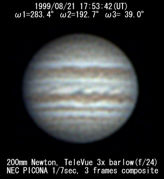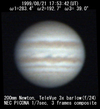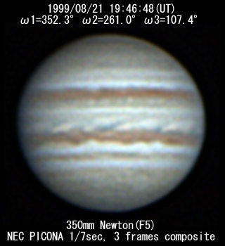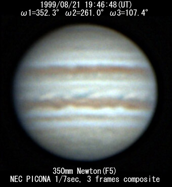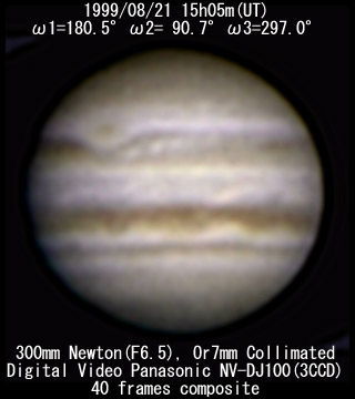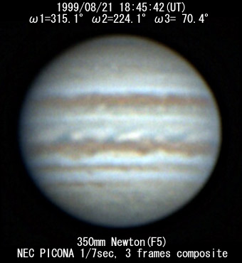 ![]() No. 37 1999/08/21 19h47m(UT) I=352.3 II=261.0 III=107.4 350mm Newton(F5) NEC PICONA 1/7sec | ![]() 強調画像作成:伊賀 | |