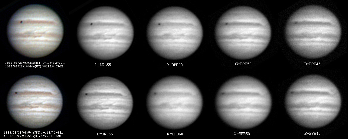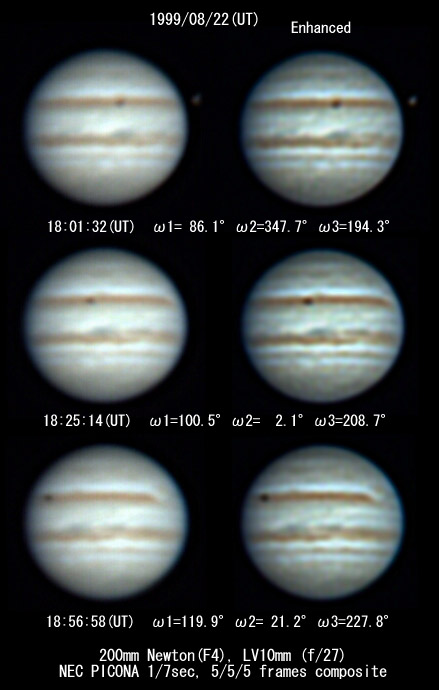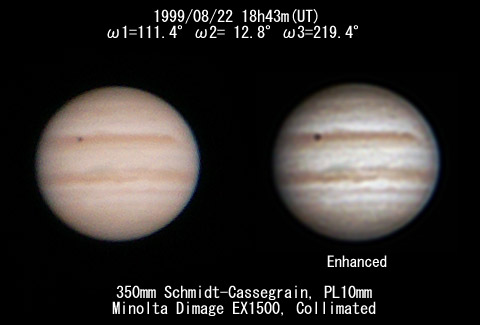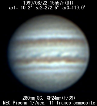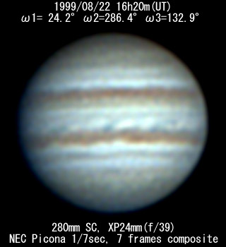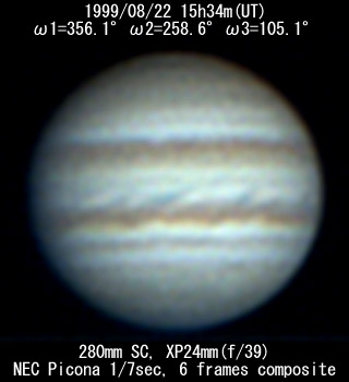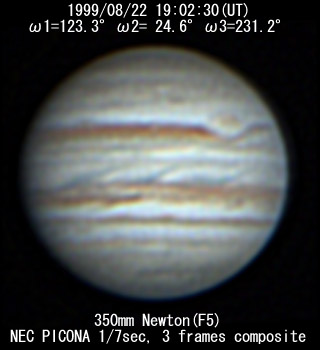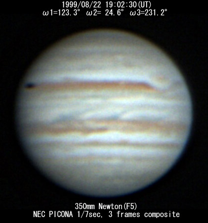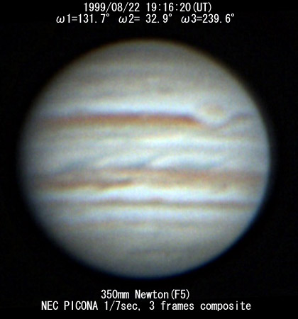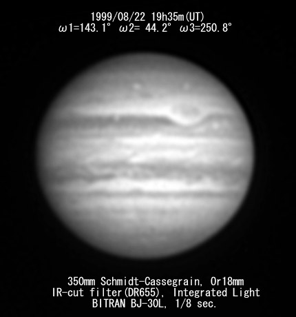 ![]() No. 38 1999/08/22 19h16m(UT) I=131.7 II= 32.9 III=239.6 350mm Newton(F5) NEC PICONA 1/7sec | ![]() 強調画像作成:伊賀 | |