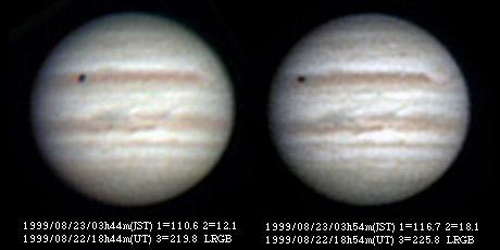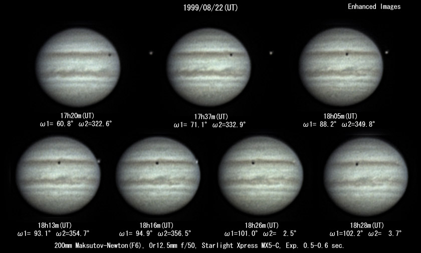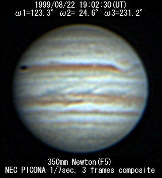 ![]() No. 37 1999/08/22 19h03m(UT) I=123.3 II= 24.6 III=231.2 350mm Newton(F5) NEC PICONA 1/7sec | ![]() 強調画像作成:伊賀 | |