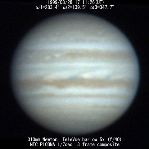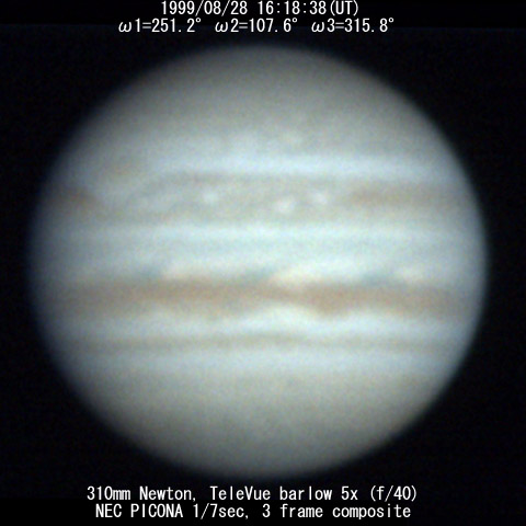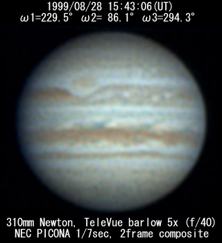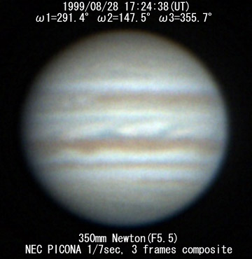 ![]() No. 43 1999/08/28 17:24:38(UT) I=291.4 II=147.5 III=355.7 350mm Newton(F5) NEC PICONA 1/7sec 3 frames composite | ![]() 強調画像作成:伊賀 | |