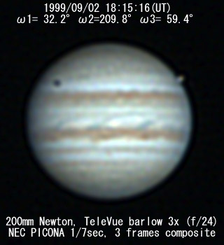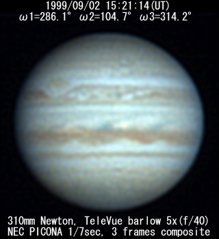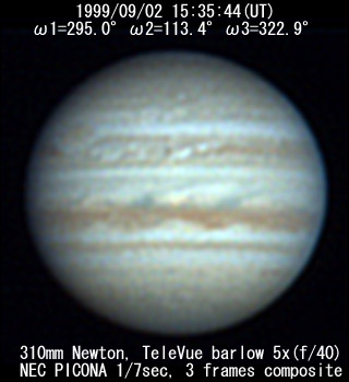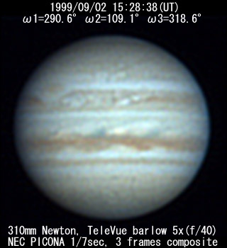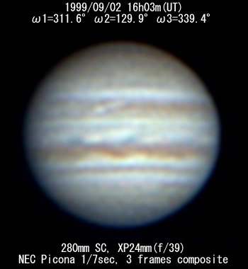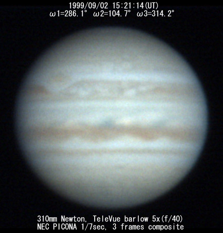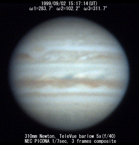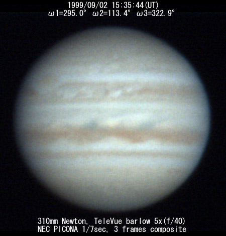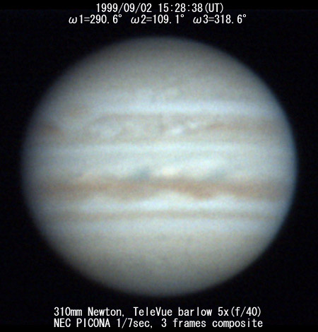 I=311.6 II=129.9 III=339.4 280mm Schmidt-Cassegrain, XP24mm(f/39) NEC Picona 1/7sec, 3 frames composite Seeing:5/10 Transp.:3/5