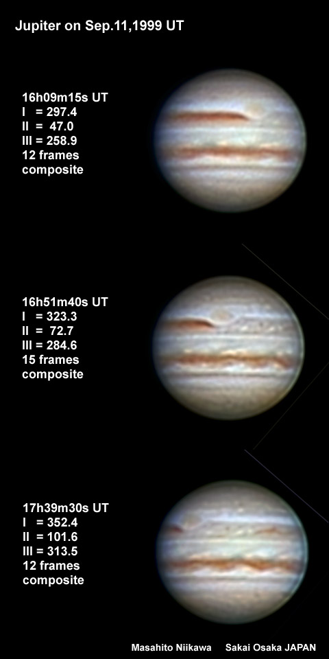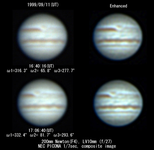1999/09/11 16h51m40s(UT) I=323.3 II= 72.7 III=284.6 15 frames composite 1999/09/11 17h39m30s(UT) I=352.4 II=101.6 III=313.5 12 frames composite Telescope : C11 (SC) D=280mm fl=2800mm Camera :Minolta DimageEx1500 Digital Camera taking lens removed Effective F No.: 25 (XP24mm Eyepiece Projection) Filter: IR cut & Low-pass built-in the camera Obs.site : Mozuhonmachi Sakai-City Osaka Japan Exposure : 1/4 sec Analog gain:6dB Seeing:5/10 Transp.:2/6 Image Processing The Maximum Entropy Method deconvolution after composite of the original taking images. And enhanced with the unsharp masking method. | ||