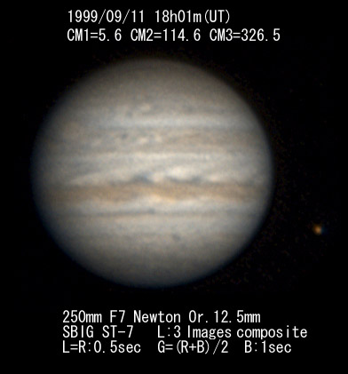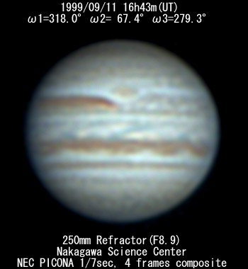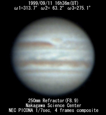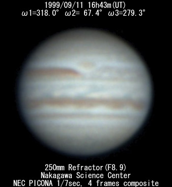![]() No. 19 1999/09/11 16h43m(UT) I=318.0 II= 67.4 III=279.3 250mm Refractor(F8.9) Nakagawa Science Center NEC Picona 1/7sec 4 frames composite |