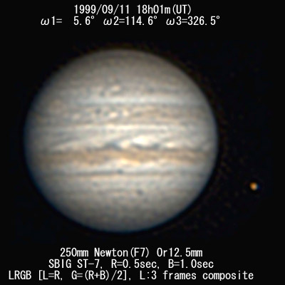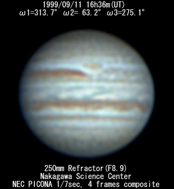 ![]() No. 18 1999/09/11 16h36m(UT) I=313.7 II= 63.2 III=275.1 250mm Refractor(F8.9) Nakagawa Science Center NEC Picona 1/7sec 4 frames composite |