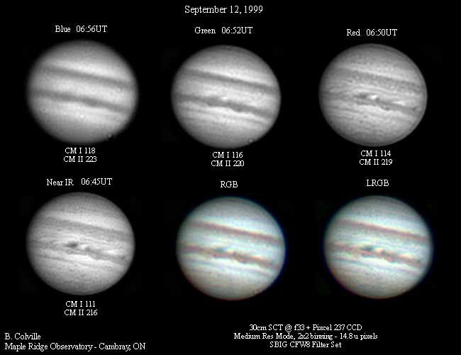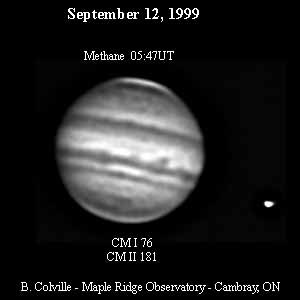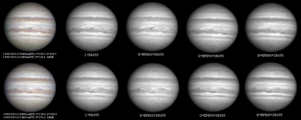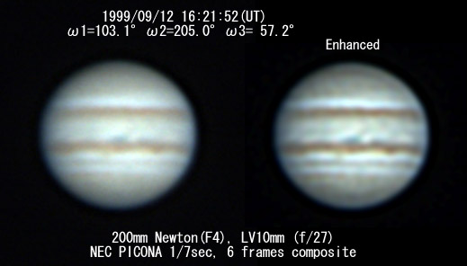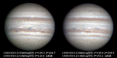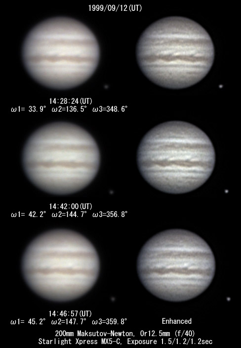No.21 1999/09/12 14:42:00(UT) I= 42.2 II=144.7 III=356.8 No.22 1999/09/12 14:46:57(UT) I= 45.2 II=147.7 III=359.8 ALTER8N 200mm Maksutov-Newton, Or12.5mm(f/50) Starlight Xpress MX5-C, 1.5sec, 1.2sec, 1.2sec