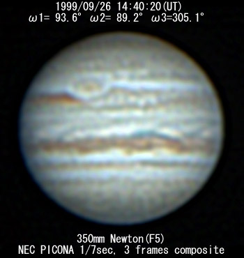 ![]() No. 50 1999/09/26 14:40:20(UT) I= 93.6 II= 89.2 III=305.1 350mm Newton(F5) NEC PICONA 1/7sec 3 frames composite | ![]() 強調画像作成:伊賀 | |