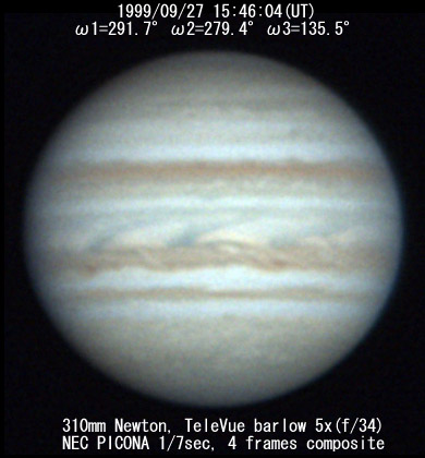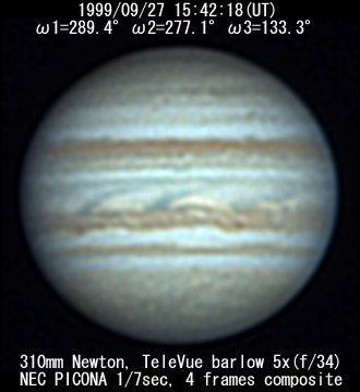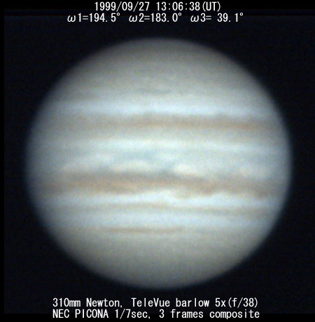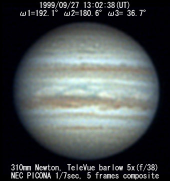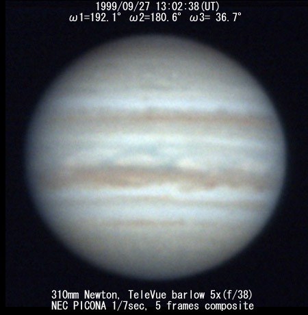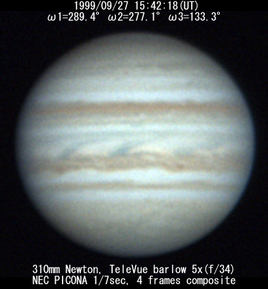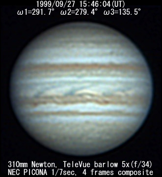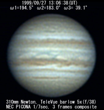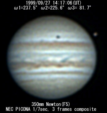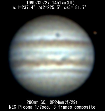 ![]() No. 51 1999/09/27 14:17:06(UT) I=237.5 II=225.6 III= 81.7 350mm Newton(F5) NEC PICONA 1/7sec 3 frames composite | ![]() 強調画像作成:伊賀 | |