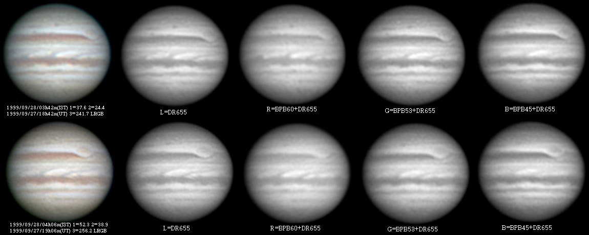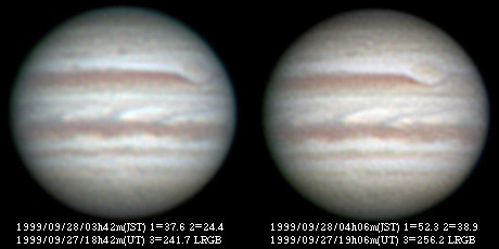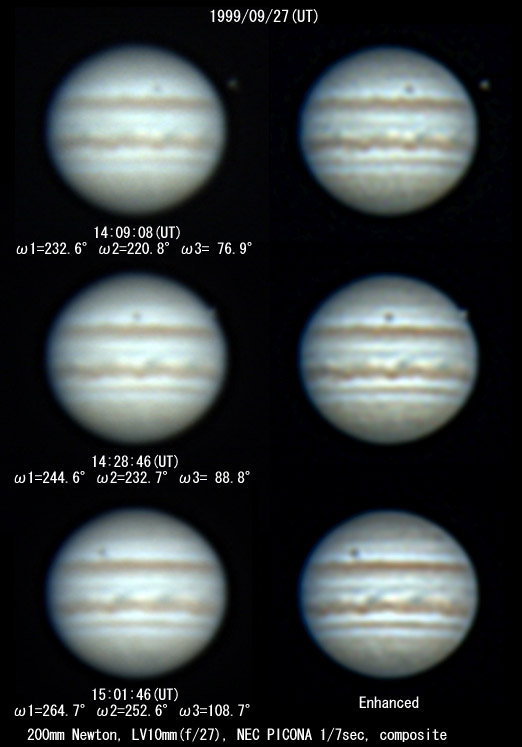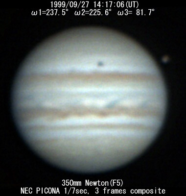 No.18 1999/09/27 14:28:46(UT) I=244.6 II=232.7 III= 88.8, 5 frames composite No.19 1999/09/27 15:01:46(UT) I=264.7 II=252.6 III=108.7, 6 frames composite De= +3.6 E.Dia=48.54"