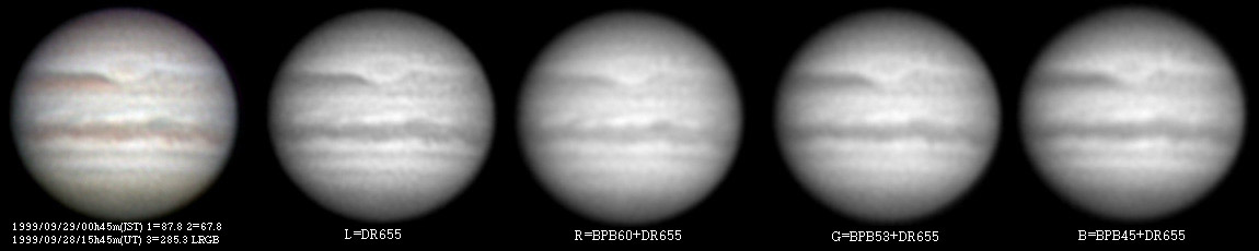 No.21 1999/09/28 15:04:42(UT) I= 64.5 II= 44.8 III=261.2, 5 frames composite No.22 1999/09/28 15:51:42(UT) I= 93.2 II= 73.2 III=289.6, 5 frames composite De= +3.6 E.Dia=48.54"