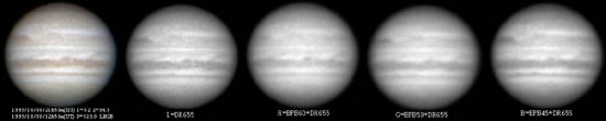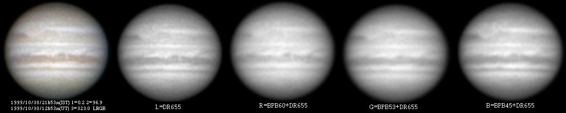 1999/10/30 15h11m06s(UT) I= 85.7 II=181.8 III= 46.7 10 frames composite 1999/10/30 15h23m07s(UT) I= 93.0 II=189.0 III= 53.9 8 frames composite 1999/10/30 17h18m36s(UT) I=163.4 II=258.8 III=123.8 6 frames composite 1999/10/30 17h47m00s(UT) I=180.8 II=276.0 III=140.9 3 frames composite Telescope : C11 (SC) D=280mm fl=2800mm Camera :Minolta DimageEx1500 Digital Camera taking lens removed Effective F No.: 25 (XP24mm Eyepiece Projection) Filter: IR cut & Low-pass built-in the camera Obs.site : Mozuhonmachi Sakai-City Osaka Japan Exposure : 1/8 sec Analog gain:6dB Seeing:5->2/10 Transp.:3/6