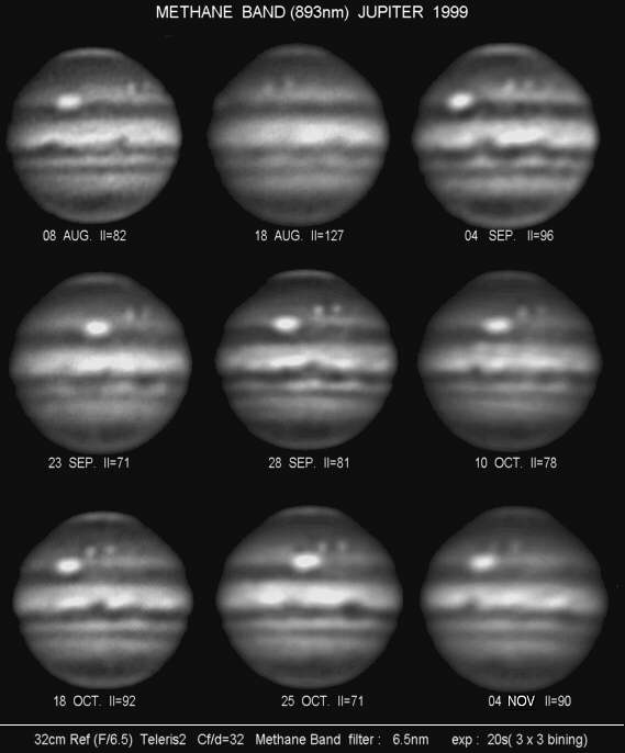 メタンバンド(893nm)で撮影すると、高層の大気の様子が分ります。大赤斑の渦は周りの大気よりも高い高度まで達しており、メタンバンドではたいへん明るく写ります。同様にSTB Oval(永続白斑)のBEとFAも木星大気の高層まで吹き上げる反時計回りの渦ですから、メタンバンドでは明るく写ります。BEとFAの間にできているSTBの小白斑は、STB Ovalとは逆の時計回りの渦で、これはメタンバンドでは写っていないので、高層まで影響する渦ではないことが分ります。