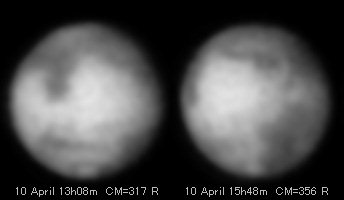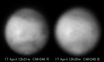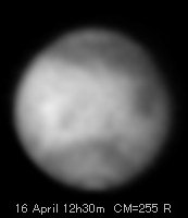 - 幾分遠のき、小さくなったのが眼視でわかる。DEの変化か、南極冠の拡張か判らぬが、ヘラスが北極冠より明るく感じられる。R光では同等の明るさである。