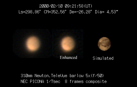 2000/02/10 09:21:58(UT) Ls=298.86 CM=352.56 De=-26.28 Dia= 4.53" 310mm Newtonian(F5) TeleVue barlow 5x f/50 2 deg. prism NEC PICONA 1/7sec,8 frames composite (強調画像:作成伊賀)